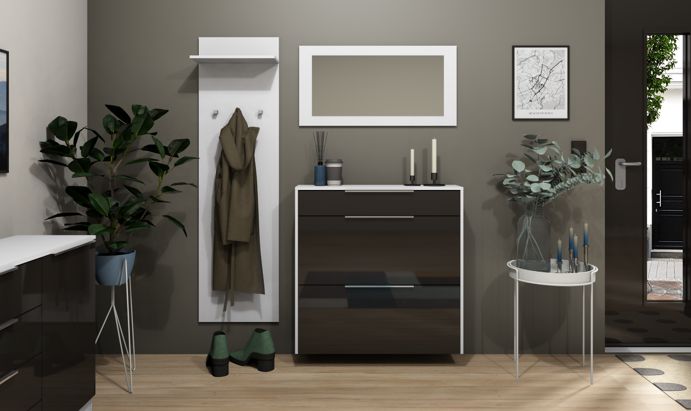 Der Korpus des Schranks ist immer weiß matt. Die Schuhschrank-Fronten sind wahlweise in matt oder glänzend erhältlich.
