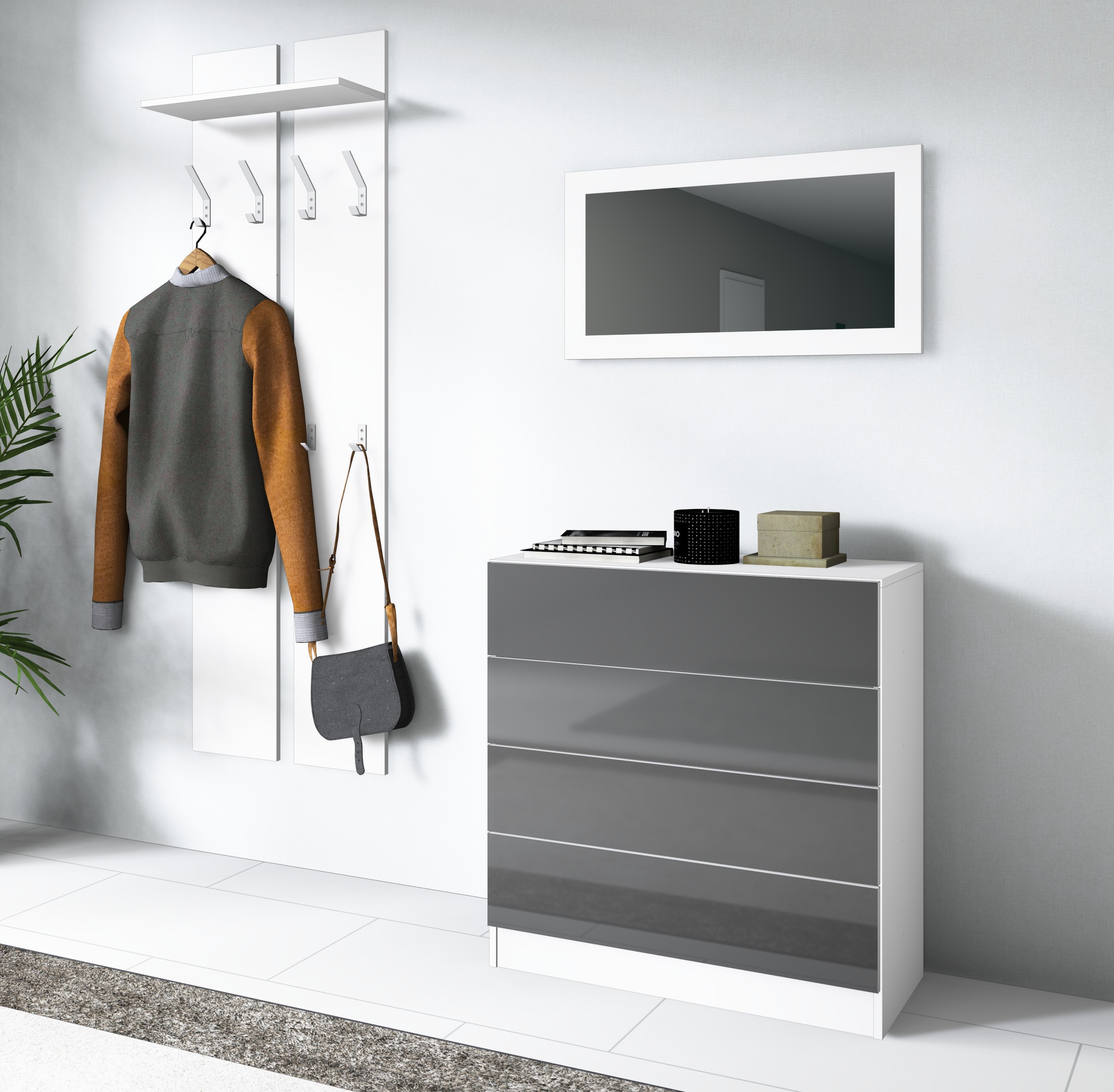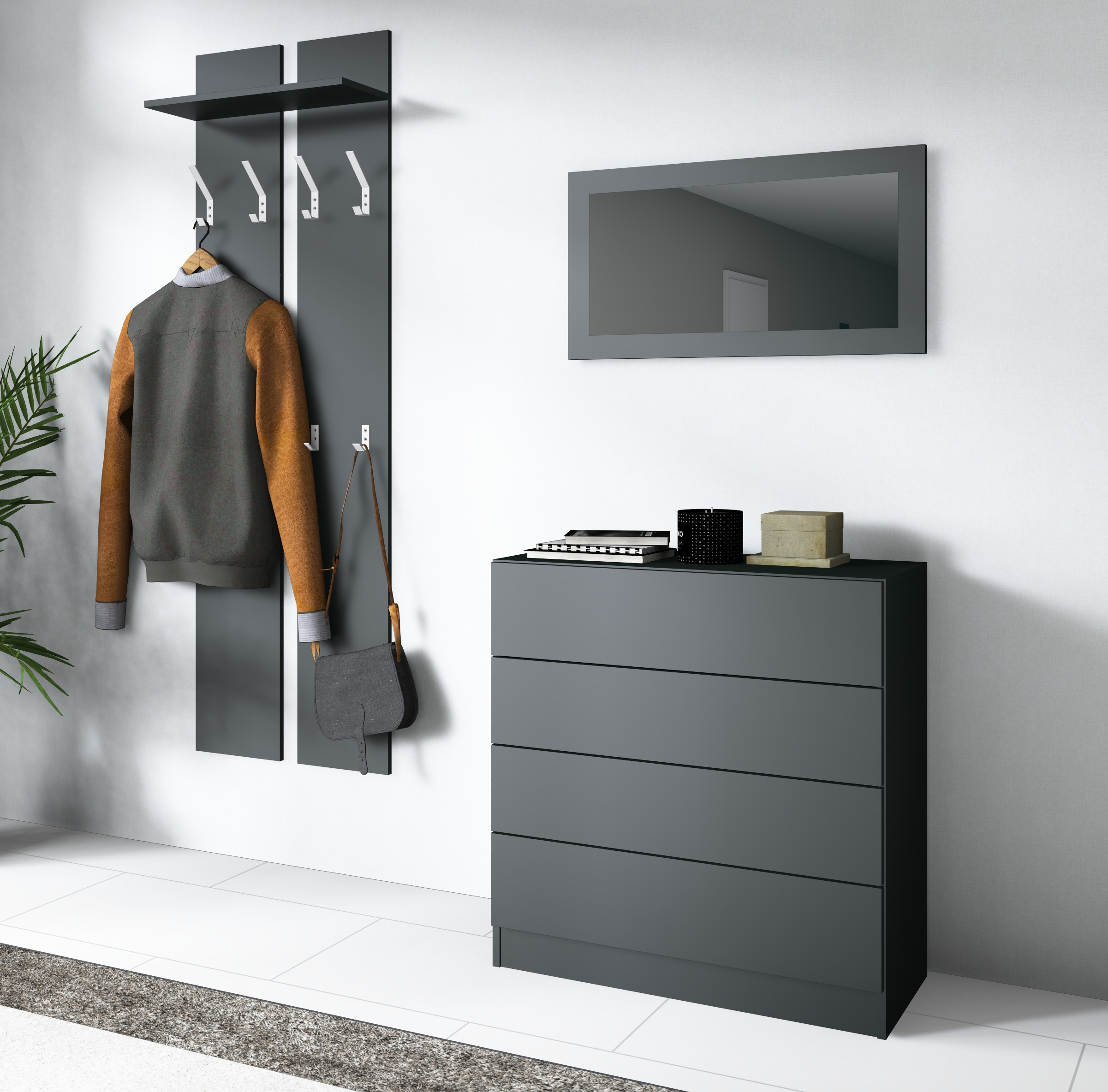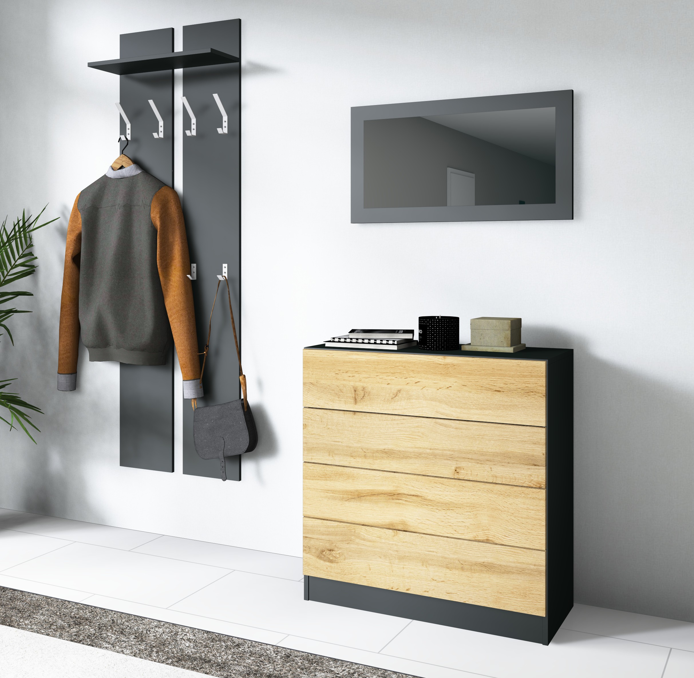 Das moderne Garderobenset "Vaasa" mit praktischer Schubkastenkommode ist eine kompakte Einrichtungslösung für Ihre Garderobe. Die Kommode verfügt über 4 Schubkästen auf Metallauszügen. Die Fronten lassen sich bequem durch eine Drucktechnik öffnen.