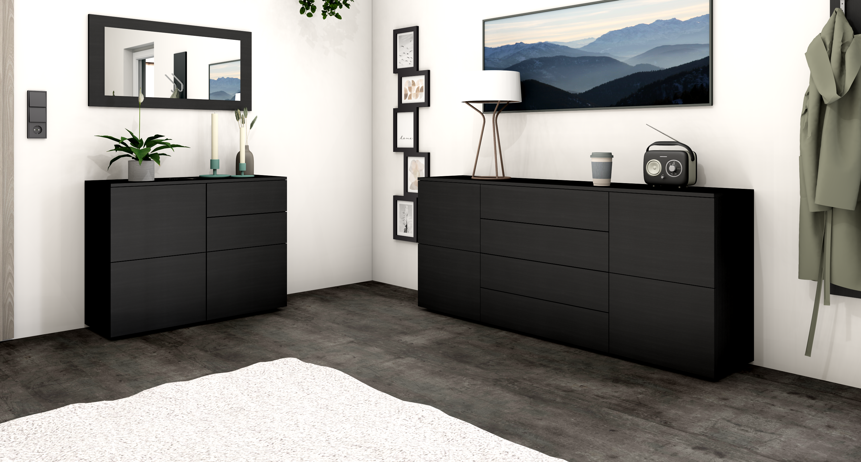 Die moderne Kommode "Rova" ist ein praktisches Möbelstück für Ihren Wohnbereich. Die Kommode verfügt über drei Türen und zwei Schubkästen, die sich durch einfache Drucktechnik öffnen lassen.