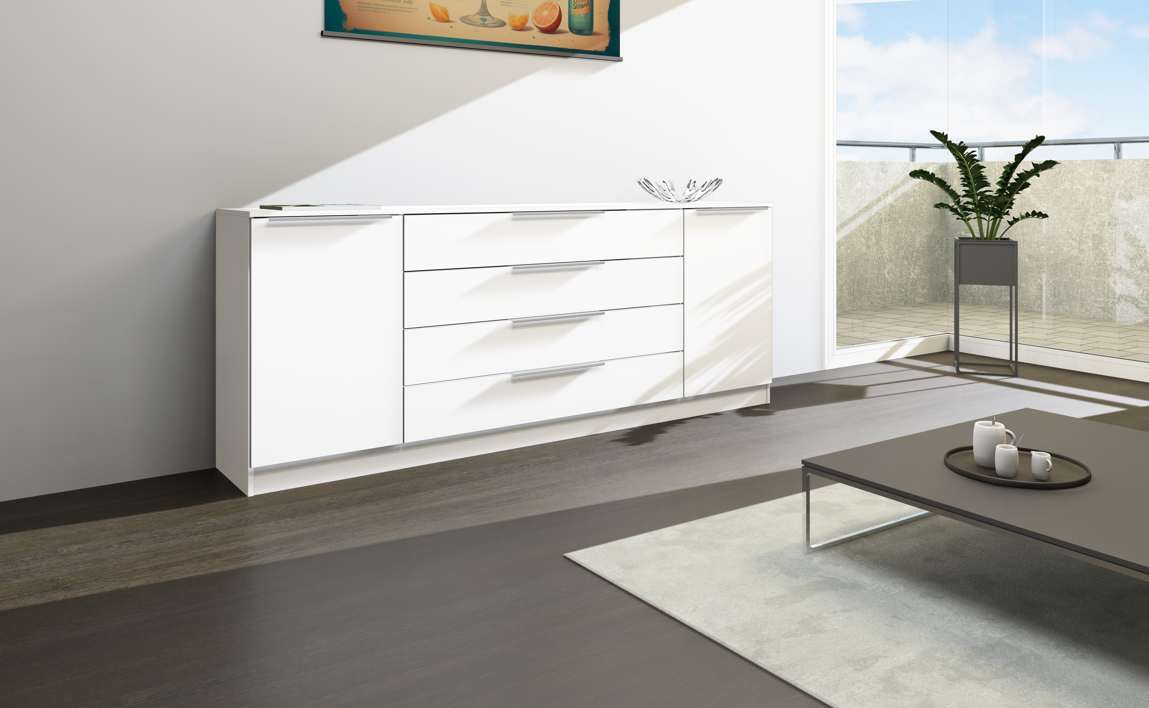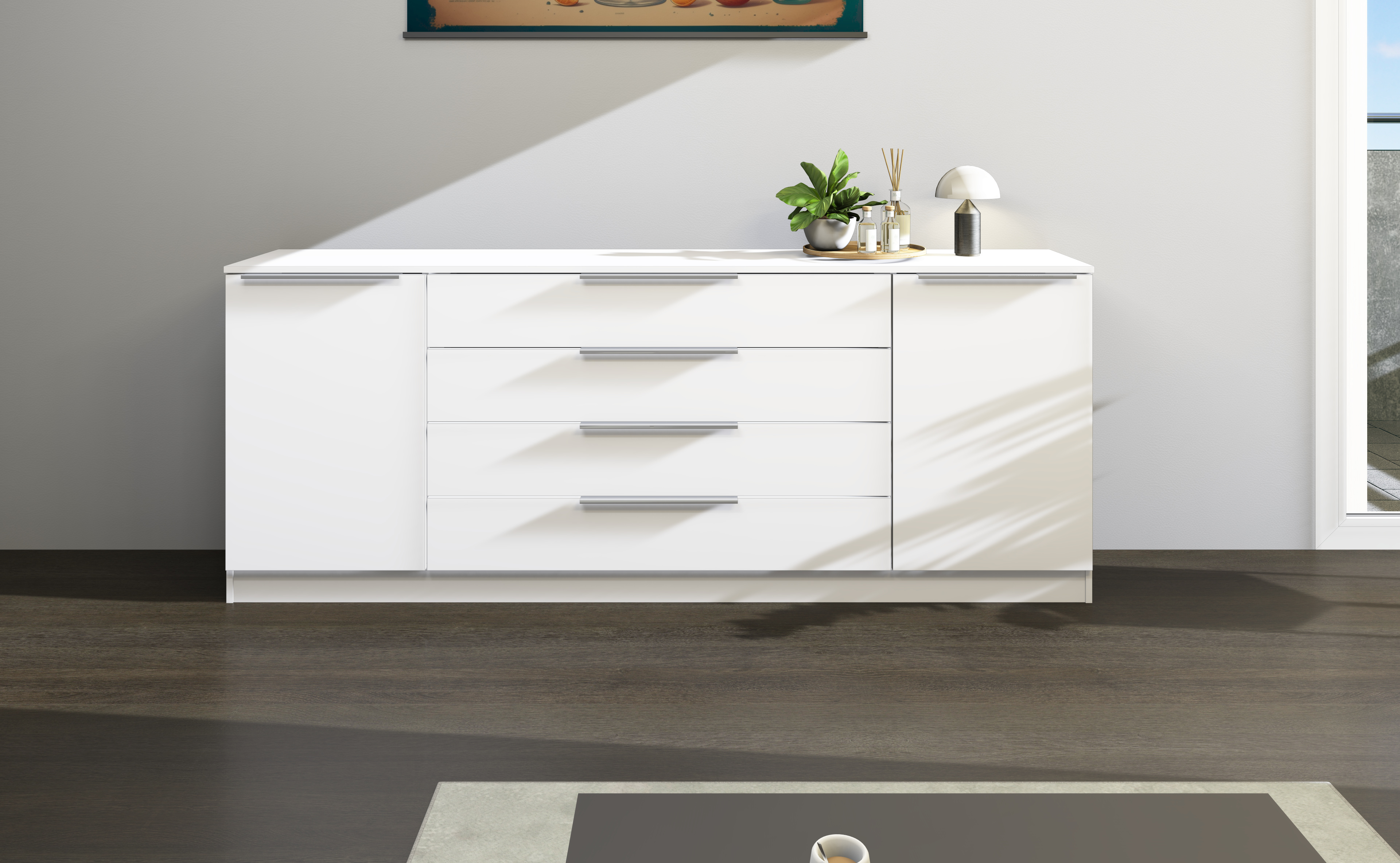 Das moderne Sideboard aus dem Garderobenprogramm "Oliva" ist ein nütztliches Möbelstück für Ihren Empfangsbereich. Hinter den Türen befindet sich je ein höhenverstellbarer Einlegeboden; vier Schubladen schaffen weiteren Stauraum für Ihre persönlichen Dinge. Die Fronten lassen sich mit hochwertigen Aluminiumgriffen öffnen. Diese praktische Anrichte ist ein wirkliches Highlight im Garderoben- und Flurbereich und wird Sie begeistern!