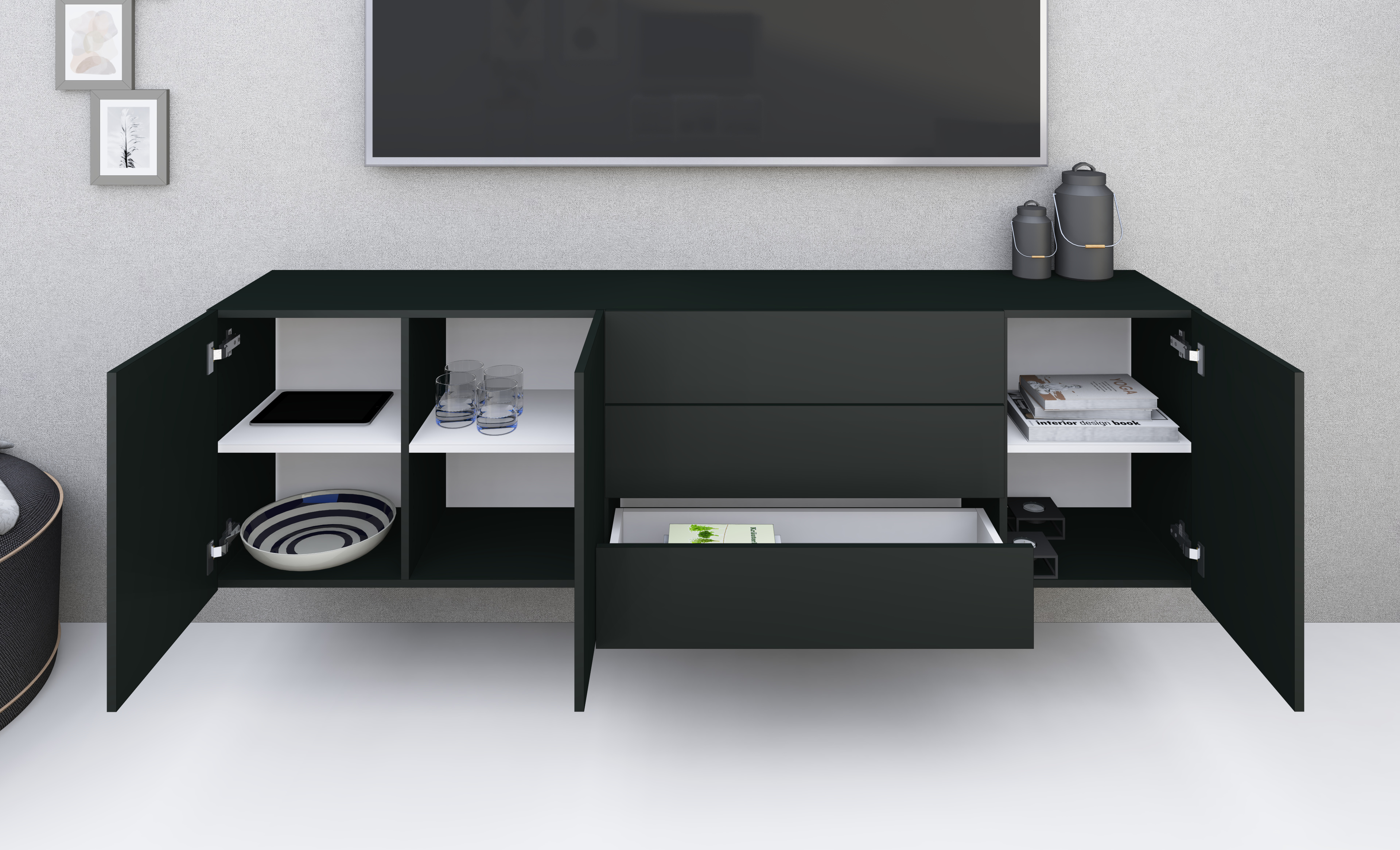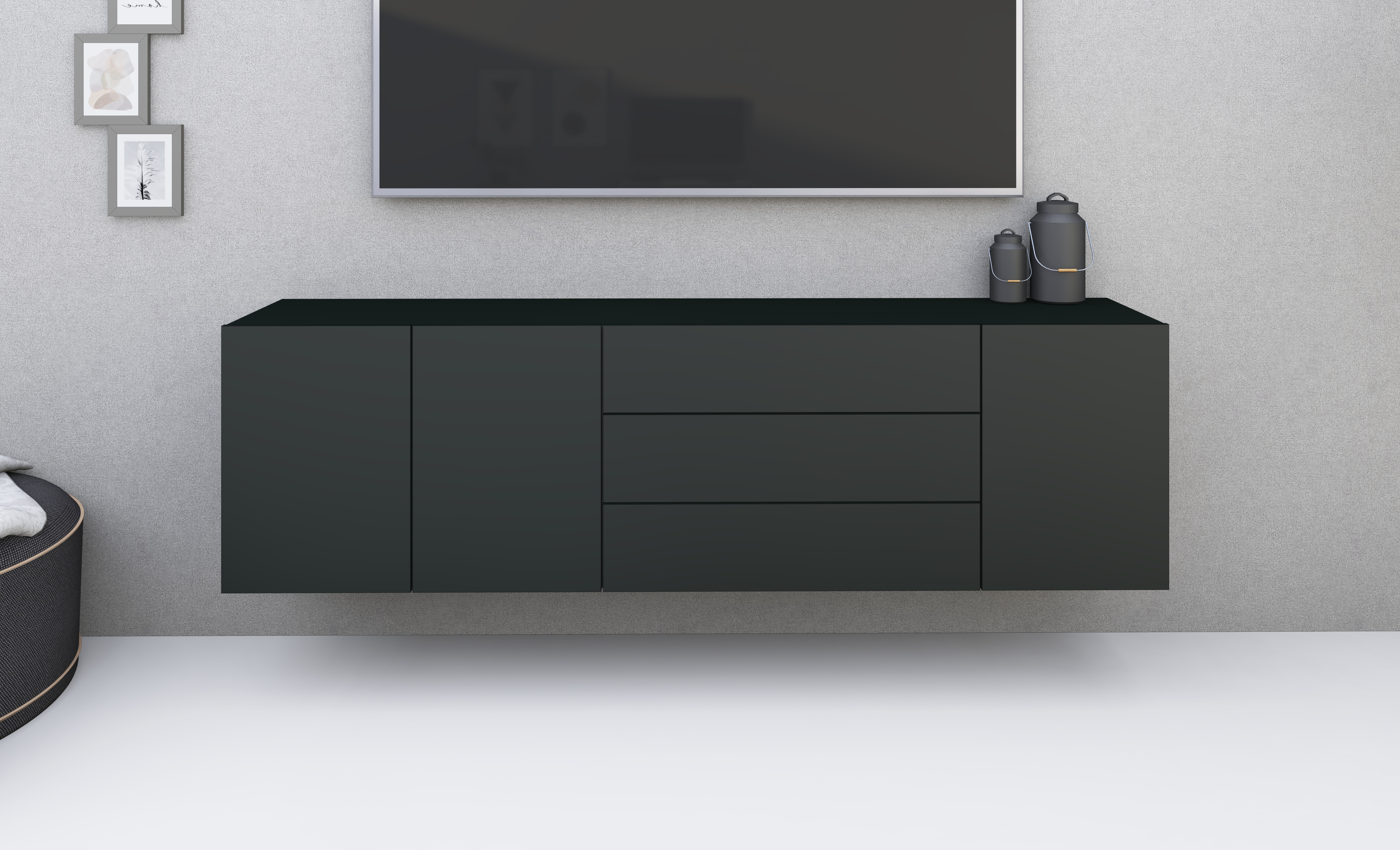 Dank seines kompakten, zeitlosen Designs und der verschiedenen Farbvarianten lässt sich dieses elegante Sideboard harmonisch in jede Einrichtung integrieren. Es ist ausschließlich zur hängenden Montage geeignet.
